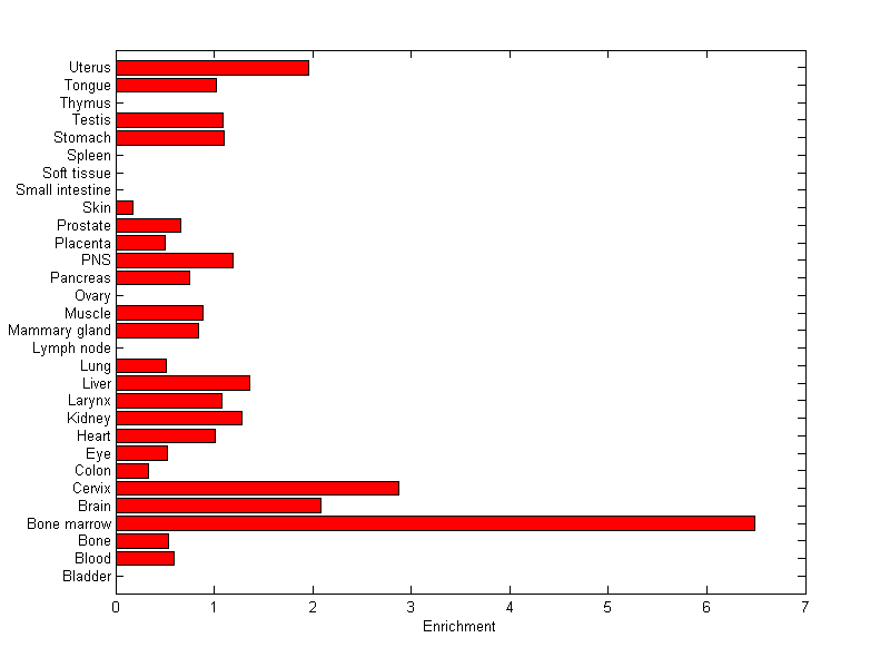 The expression level is normalized with tissue-library size. Each value for a gene in a tissue is a ratio of observed ESTs to the expected one in this tissue. The expected number of ESTs is the product of total ESTs of the gene and the fraction of total ESTs in the tissue among all ESTs in 30 tissues.
