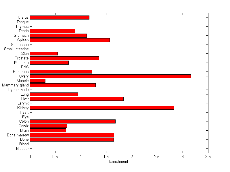 The expression level is normalized with tissue-library size. Each value for a gene in a tissue is a ratio of observed ESTs to the expected one in this tissue. The expected number of ESTs is the product of total ESTs of the gene and the fraction of total ESTs in the tissue among all ESTs in 30 tissues.