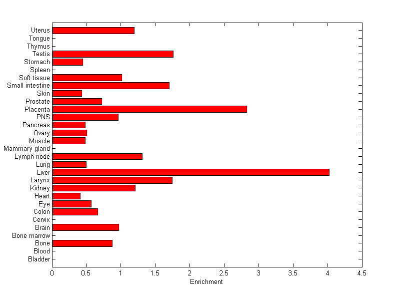 The expression level is normalized with tissue-library size. Each value for a gene in a tissue is a ratio of observed ESTs to the expected one in this tissue. The expected number of ESTs is the product of total ESTs of the gene and the fraction of total ESTs in the tissue among all ESTs in 30 tissues.