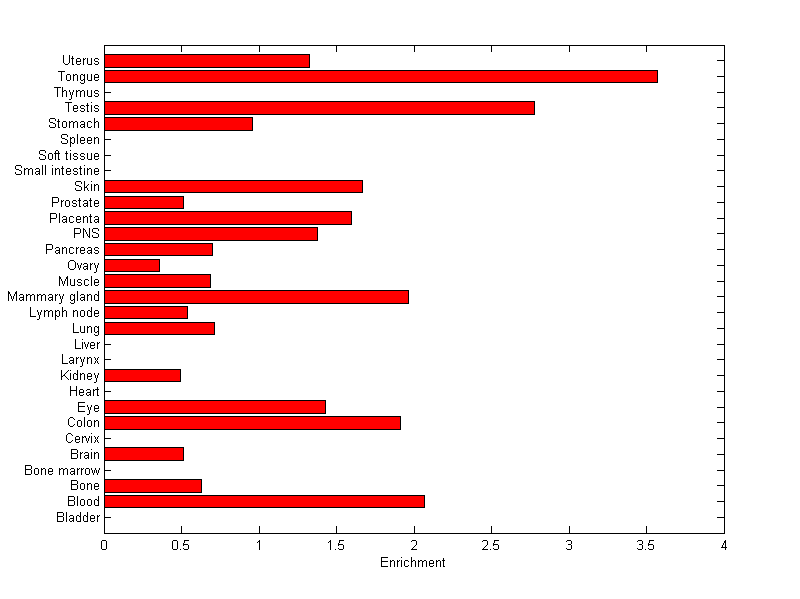The expression level is normalized with tissue-library size. Each value for a gene in a tissue is a ratio of observed ESTs to the expected one in this tissue. The expected number of ESTs is the product of total ESTs of the gene and the fraction of total ESTs in the tissue among all ESTs in 30 tissues.