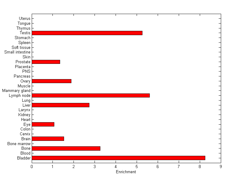 The expression level is normalized with tissue-library size. Each value for a gene in a tissue is a ratio of observed ESTs to the expected one in this tissue. The expected number of ESTs is the product of total ESTs of the gene and the fraction of total ESTs in the tissue among all ESTs in 30 tissues.