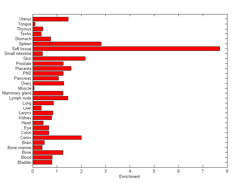The expression level is normalized with tissue-library size. Each value for a gene in a tissue is a ratio of observed ESTs to the expected one in this tissue. The expected number of ESTs is the product of total ESTs of the gene and the fraction of total ESTs in the tissue among all ESTs in 30 tissues.