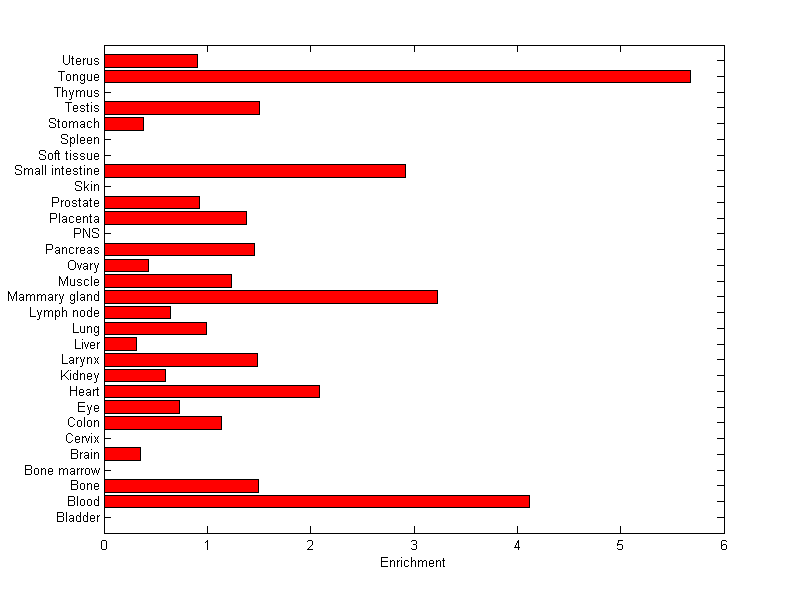 The expression level is normalized with tissue-library size. Each value for a gene in a tissue is a ratio of observed ESTs to the expected one in this tissue. The expected number of ESTs is the product of total ESTs of the gene and the fraction of total ESTs in the tissue among all ESTs in 30 tissues.