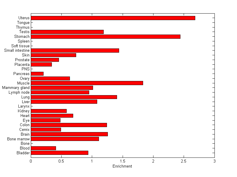The expression level is normalized with tissue-library size. Each value for a gene in a tissue is a ratio of observed ESTs to the expected one in this tissue. The expected number of ESTs is the product of total ESTs of the gene and the fraction of total ESTs in the tissue among all ESTs in 30 tissues.