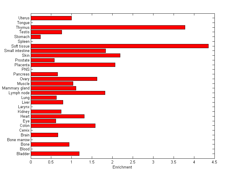 The expression level is normalized with tissue-library size. Each value for a gene in a tissue is a ratio of observed ESTs to the expected one in this tissue. The expected number of ESTs is the product of total ESTs of the gene and the fraction of total ESTs in the tissue among all ESTs in 30 tissues.