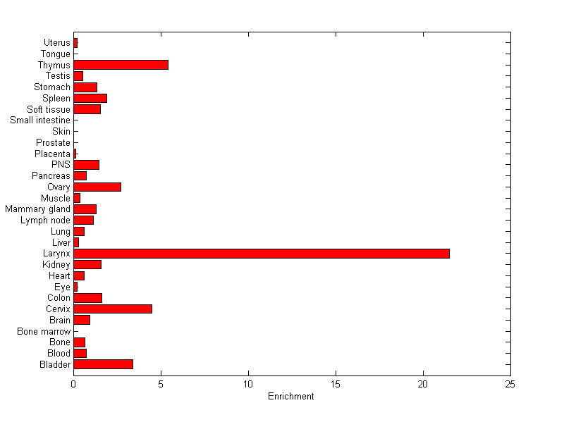 The expression level is normalized with tissue-library size. Each value for a gene in a tissue is a ratio of observed ESTs to the expected one in this tissue. The expected number of ESTs is the product of total ESTs of the gene and the fraction of total ESTs in the tissue among all ESTs in 30 tissues.