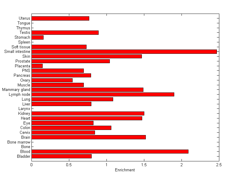 The expression level is normalized with tissue-library size. Each value for a gene in a tissue is a ratio of observed ESTs to the expected one in this tissue. The expected number of ESTs is the product of total ESTs of the gene and the fraction of total ESTs in the tissue among all ESTs in 30 tissues.