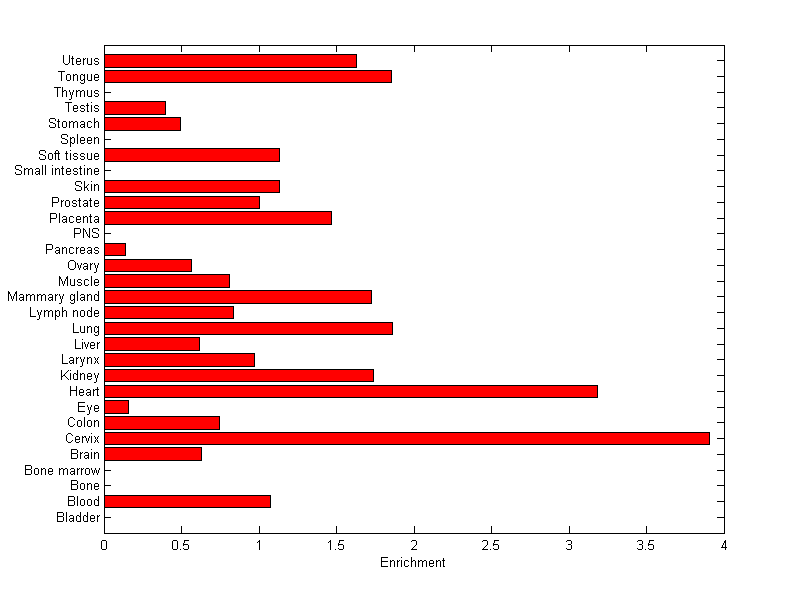 The expression level is normalized with tissue-library size. Each value for a gene in a tissue is a ratio of observed ESTs to the expected one in this tissue. The expected number of ESTs is the product of total ESTs of the gene and the fraction of total ESTs in the tissue among all ESTs in 30 tissues.