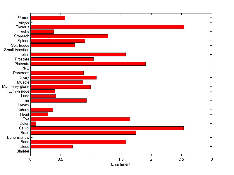 The expression level is normalized with tissue-library size. Each value for a gene in a tissue is a ratio of observed ESTs to the expected one in this tissue. The expected number of ESTs is the product of total ESTs of the gene and the fraction of total ESTs in the tissue among all ESTs in 30 tissues.