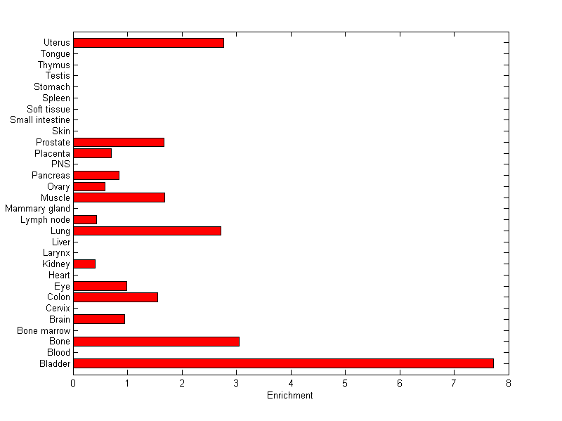 The expression level is normalized with tissue-library size. Each value for a gene in a tissue is a ratio of observed ESTs to the expected one in this tissue. The expected number of ESTs is the product of total ESTs of the gene and the fraction of total ESTs in the tissue among all ESTs in 30 tissues.