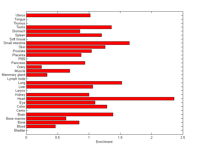 The expression level is normalized with tissue-library size. Each value for a gene in a tissue is a ratio of observed ESTs to the expected one in this tissue. The expected number of ESTs is the product of total ESTs of the gene and the fraction of total ESTs in the tissue among all ESTs in 30 tissues.