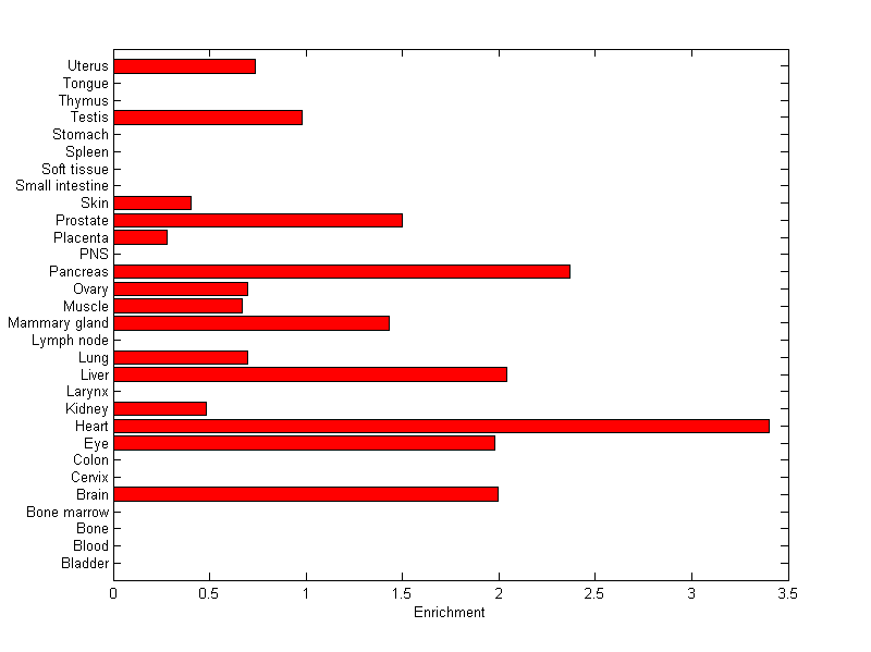 The expression level is normalized with tissue-library size. Each value for a gene in a tissue is a ratio of observed ESTs to the expected one in this tissue. The expected number of ESTs is the product of total ESTs of the gene and the fraction of total ESTs in the tissue among all ESTs in 30 tissues.