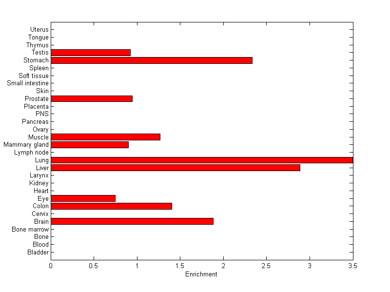 The expression level is normalized with tissue-library size. Each value for a gene in a tissue is a ratio of observed ESTs to the expected one in this tissue. The expected number of ESTs is the product of total ESTs of the gene and the fraction of total ESTs in the tissue among all ESTs in 30 tissues.