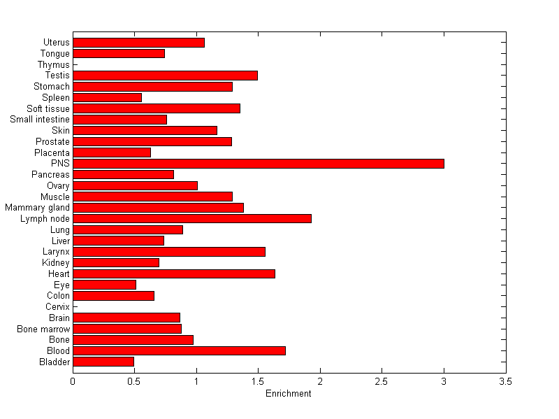 The expression level is normalized with tissue-library size. Each value for a gene in a tissue is a ratio of observed ESTs to the expected one in this tissue. The expected number of ESTs is the product of total ESTs of the gene and the fraction of total ESTs in the tissue among all ESTs in 30 tissues.