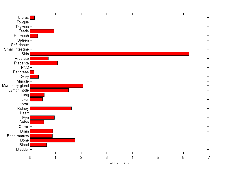 The expression level is normalized with tissue-library size. Each value for a gene in a tissue is a ratio of observed ESTs to the expected one in this tissue. The expected number of ESTs is the product of total ESTs of the gene and the fraction of total ESTs in the tissue among all ESTs in 30 tissues.