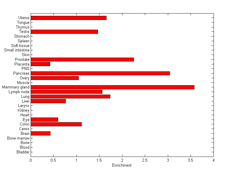 The expression level is normalized with tissue-library size. Each value for a gene in a tissue is a ratio of observed ESTs to the expected one in this tissue. The expected number of ESTs is the product of total ESTs of the gene and the fraction of total ESTs in the tissue among all ESTs in 30 tissues.