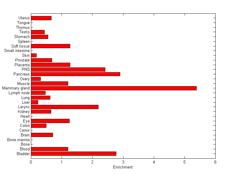 About the profile: The expression level is normalized with tissue-library size. Each value for a gene in a tissue is a ratio of observed ESTs to the expected one in this tissue. The expected number of ESTs is the product of total ESTs of the gene and the fraction of total ESTs in the tissue among all ESTs in 30 tissues. Summary: This gene is preferentially expressed in [mammary_gland] Download: |