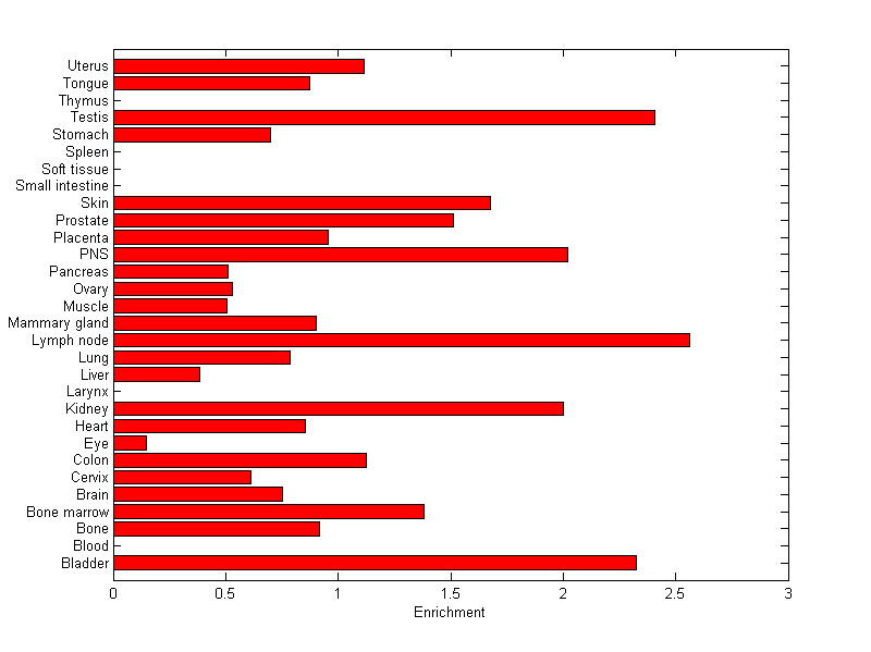 The expression level is normalized with tissue-library size. Each value for a gene in a tissue is a ratio of observed ESTs to the expected one in this tissue. The expected number of ESTs is the product of total ESTs of the gene and the fraction of total ESTs in the tissue among all ESTs in 30 tissues.