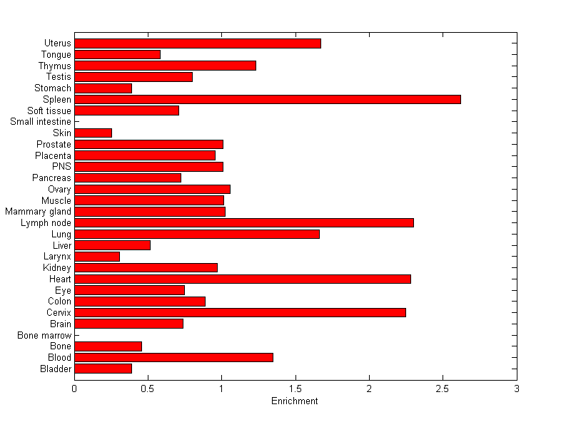 The expression level is normalized with tissue-library size. Each value for a gene in a tissue is a ratio of observed ESTs to the expected one in this tissue. The expected number of ESTs is the product of total ESTs of the gene and the fraction of total ESTs in the tissue among all ESTs in 30 tissues.
