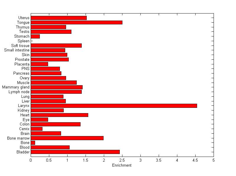 The expression level is normalized with tissue-library size. Each value for a gene in a tissue is a ratio of observed ESTs to the expected one in this tissue. The expected number of ESTs is the product of total ESTs of the gene and the fraction of total ESTs in the tissue among all ESTs in 30 tissues.
