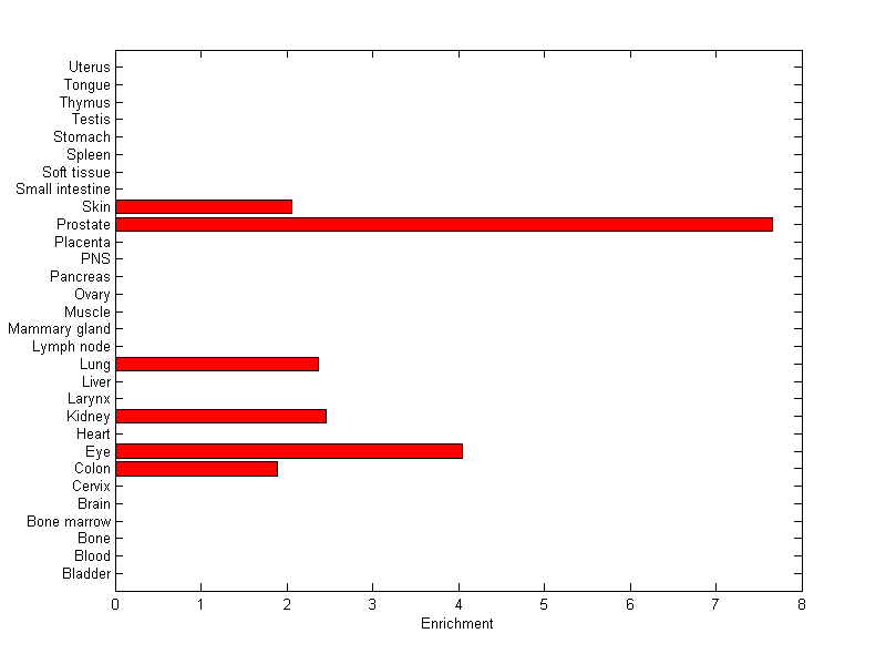 The expression level is normalized with tissue-library size. Each value for a gene in a tissue is a ratio of observed ESTs to the expected one in this tissue. The expected number of ESTs is the product of total ESTs of the gene and the fraction of total ESTs in the tissue among all ESTs in 30 tissues.