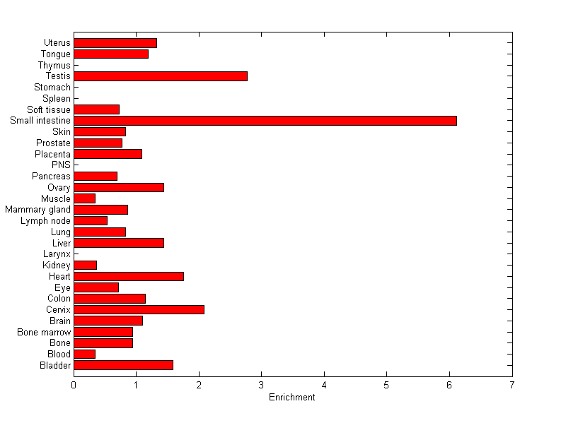The expression level is normalized with tissue-library size. Each value for a gene in a tissue is a ratio of observed ESTs to the expected one in this tissue. The expected number of ESTs is the product of total ESTs of the gene and the fraction of total ESTs in the tissue among all ESTs in 30 tissues.