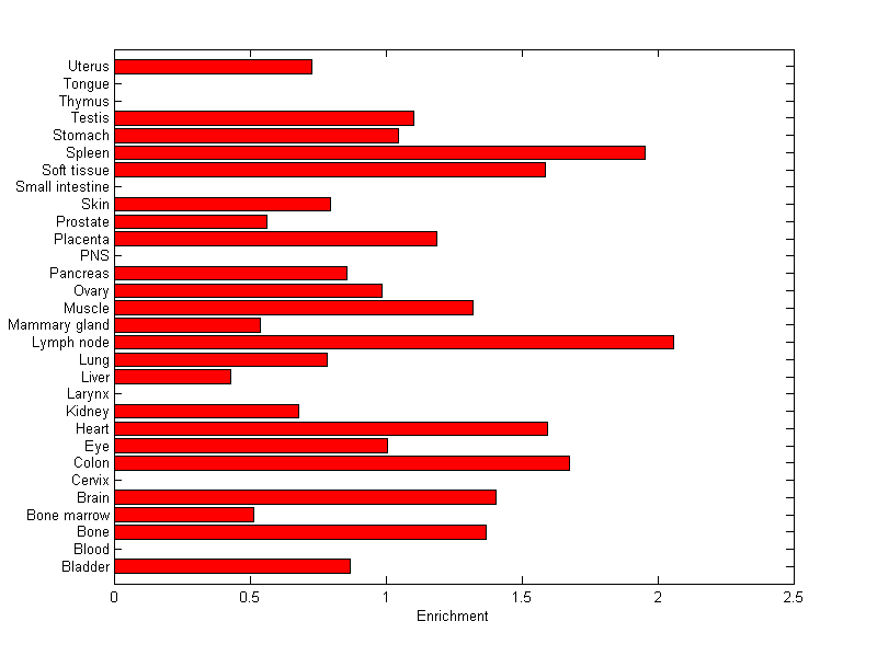 The expression level is normalized with tissue-library size. Each value for a gene in a tissue is a ratio of observed ESTs to the expected one in this tissue. The expected number of ESTs is the product of total ESTs of the gene and the fraction of total ESTs in the tissue among all ESTs in 30 tissues.