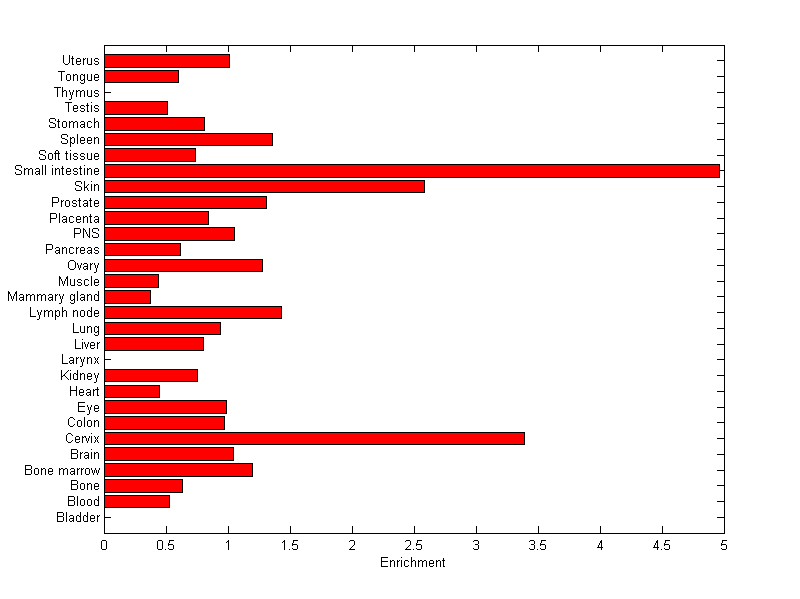 The expression level is normalized with tissue-library size. Each value for a gene in a tissue is a ratio of observed ESTs to the expected one in this tissue. The expected number of ESTs is the product of total ESTs of the gene and the fraction of total ESTs in the tissue among all ESTs in 30 tissues.