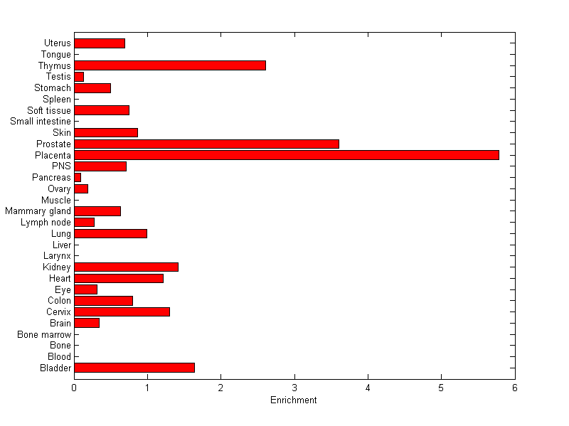 The expression level is normalized with tissue-library size. Each value for a gene in a tissue is a ratio of observed ESTs to the expected one in this tissue. The expected number of ESTs is the product of total ESTs of the gene and the fraction of total ESTs in the tissue among all ESTs in 30 tissues.
