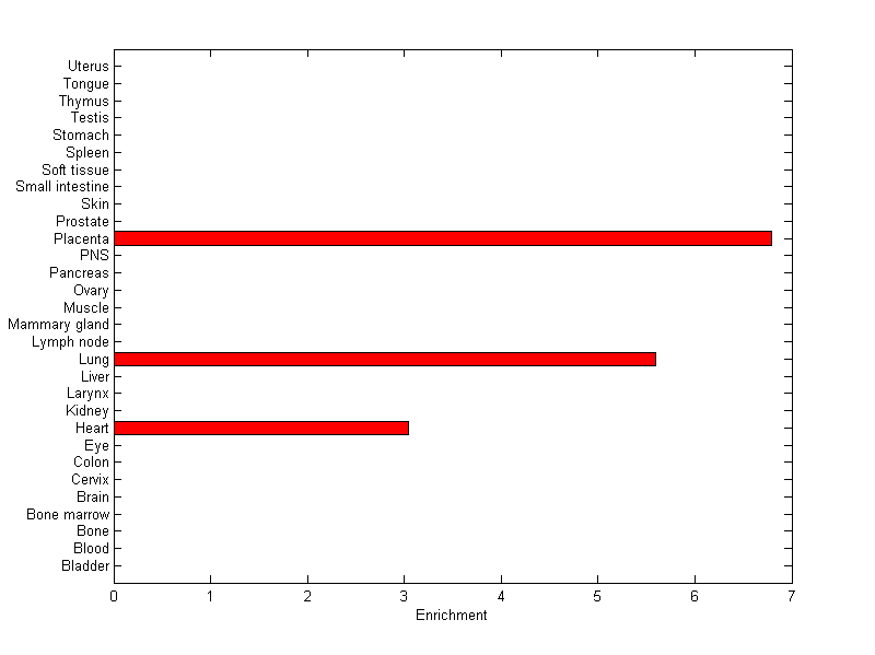 About the profile: The expression level is normalized with tissue-library size. Each value for a gene in a tissue is a ratio of observed ESTs to the expected one in this tissue. The expected number of ESTs is the product of total ESTs of the gene and the fraction of total ESTs in the tissue among all ESTs in 30 tissues. Summary: This gene is preferentially expressed in [lung, placenta] Download: |