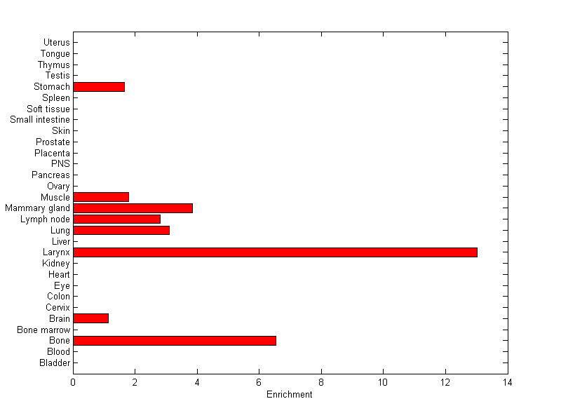 The expression level is normalized with tissue-library size. Each value for a gene in a tissue is a ratio of observed ESTs to the expected one in this tissue. The expected number of ESTs is the product of total ESTs of the gene and the fraction of total ESTs in the tissue among all ESTs in 30 tissues.