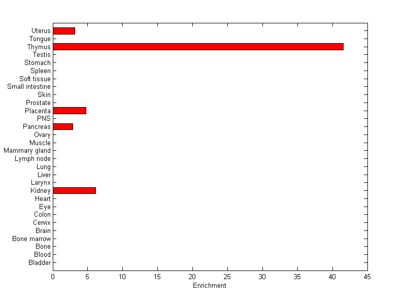 The expression level is normalized with tissue-library size. Each value for a gene in a tissue is a ratio of observed ESTs to the expected one in this tissue. The expected number of ESTs is the product of total ESTs of the gene and the fraction of total ESTs in the tissue among all ESTs in 30 tissues.