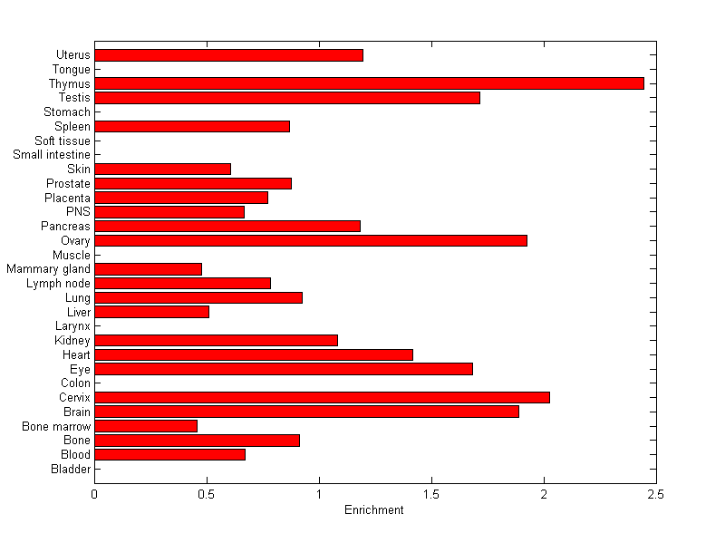 The expression level is normalized with tissue-library size. Each value for a gene in a tissue is a ratio of observed ESTs to the expected one in this tissue. The expected number of ESTs is the product of total ESTs of the gene and the fraction of total ESTs in the tissue among all ESTs in 30 tissues.