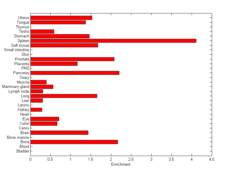 The expression level is normalized with tissue-library size. Each value for a gene in a tissue is a ratio of observed ESTs to the expected one in this tissue. The expected number of ESTs is the product of total ESTs of the gene and the fraction of total ESTs in the tissue among all ESTs in 30 tissues.