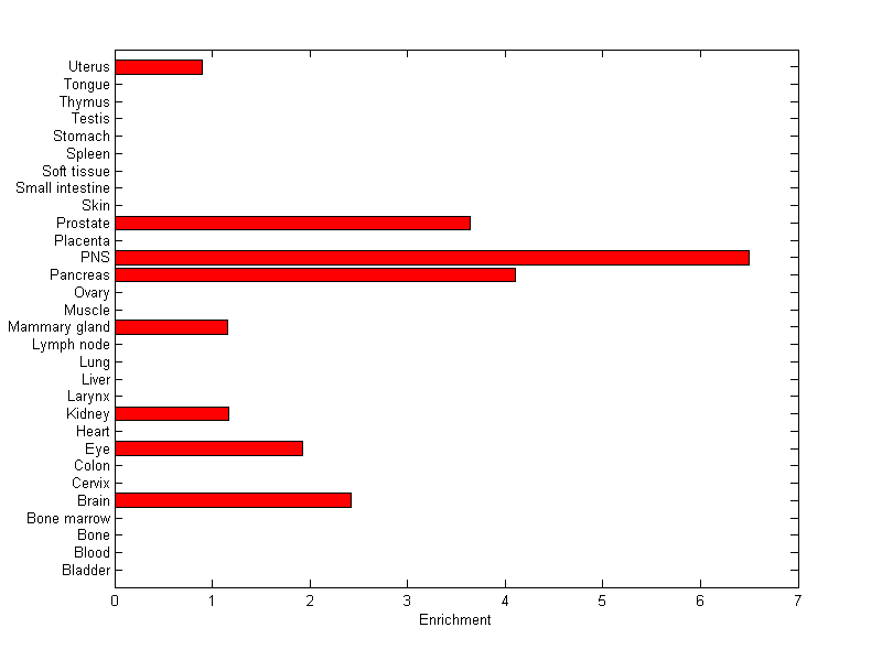 The expression level is normalized with tissue-library size. Each value for a gene in a tissue is a ratio of observed ESTs to the expected one in this tissue. The expected number of ESTs is the product of total ESTs of the gene and the fraction of total ESTs in the tissue among all ESTs in 30 tissues.