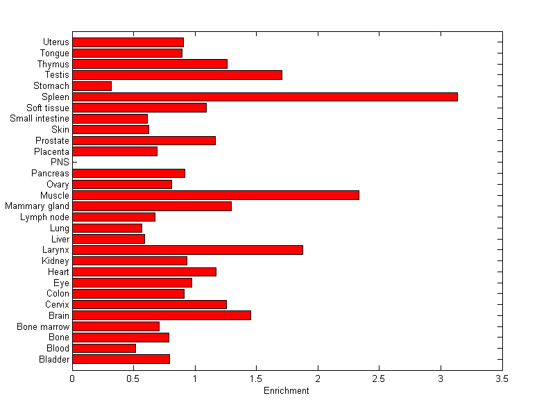 The expression level is normalized with tissue-library size. Each value for a gene in a tissue is a ratio of observed ESTs to the expected one in this tissue. The expected number of ESTs is the product of total ESTs of the gene and the fraction of total ESTs in the tissue among all ESTs in 30 tissues.