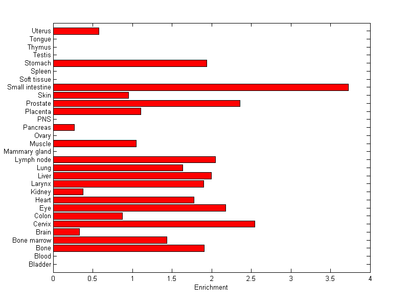 The expression level is normalized with tissue-library size. Each value for a gene in a tissue is a ratio of observed ESTs to the expected one in this tissue. The expected number of ESTs is the product of total ESTs of the gene and the fraction of total ESTs in the tissue among all ESTs in 30 tissues.
