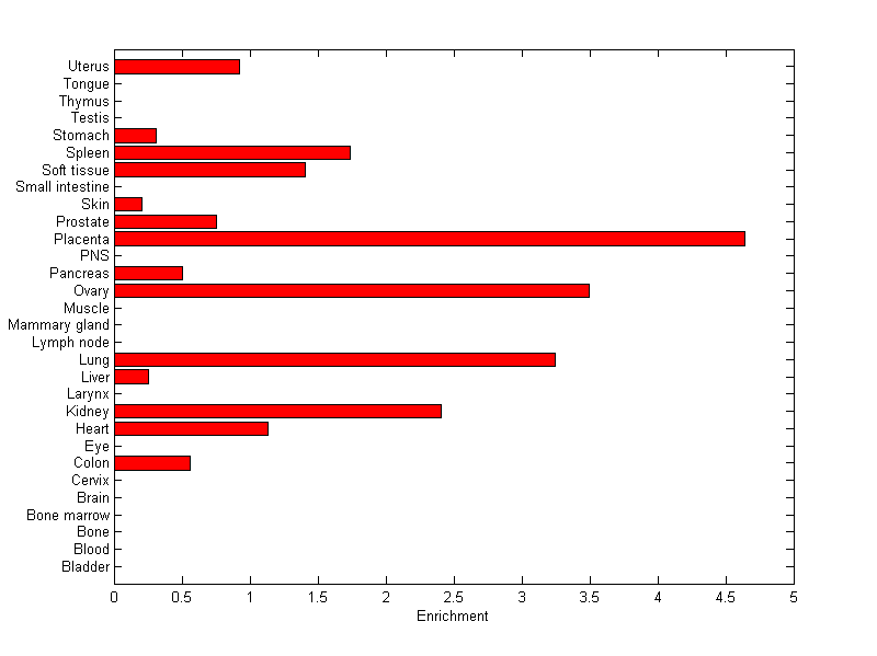 The expression level is normalized with tissue-library size. Each value for a gene in a tissue is a ratio of observed ESTs to the expected one in this tissue. The expected number of ESTs is the product of total ESTs of the gene and the fraction of total ESTs in the tissue among all ESTs in 30 tissues.