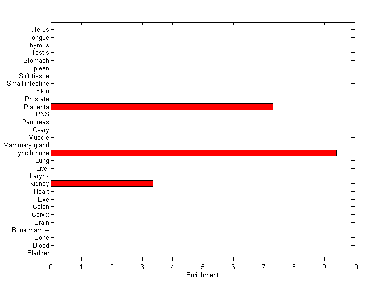 About the profile: The expression level is normalized with tissue-library size. Each value for a gene in a tissue is a ratio of observed ESTs to the expected one in this tissue. The expected number of ESTs is the product of total ESTs of the gene and the fraction of total ESTs in the tissue among all ESTs in 30 tissues. Summary: This gene is preferentially expressed in [lymph_node, placenta] Download: |