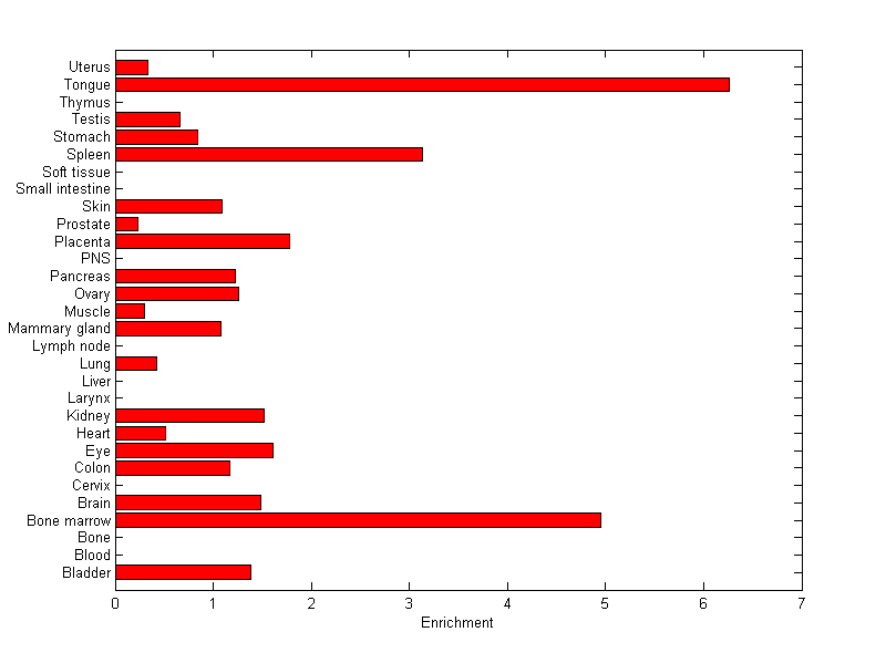 The expression level is normalized with tissue-library size. Each value for a gene in a tissue is a ratio of observed ESTs to the expected one in this tissue. The expected number of ESTs is the product of total ESTs of the gene and the fraction of total ESTs in the tissue among all ESTs in 30 tissues.