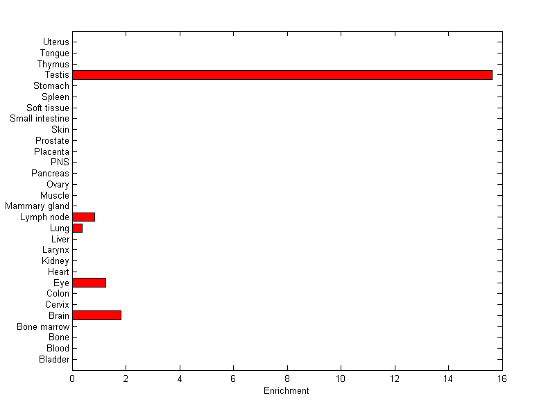 The expression level is normalized with tissue-library size. Each value for a gene in a tissue is a ratio of observed ESTs to the expected one in this tissue. The expected number of ESTs is the product of total ESTs of the gene and the fraction of total ESTs in the tissue among all ESTs in 30 tissues.