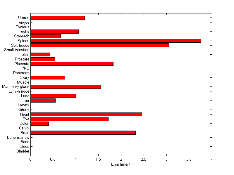 The expression level is normalized with tissue-library size. Each value for a gene in a tissue is a ratio of observed ESTs to the expected one in this tissue. The expected number of ESTs is the product of total ESTs of the gene and the fraction of total ESTs in the tissue among all ESTs in 30 tissues.