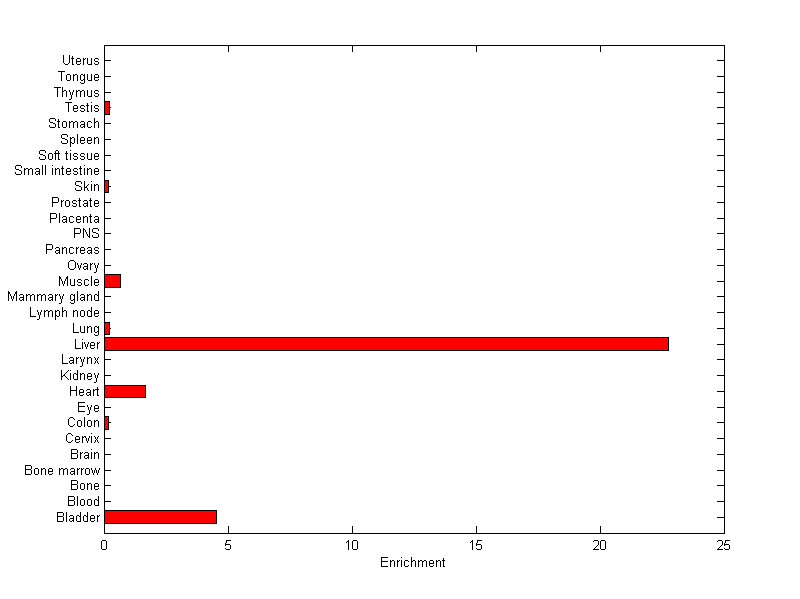 The expression level is normalized with tissue-library size. Each value for a gene in a tissue is a ratio of observed ESTs to the expected one in this tissue. The expected number of ESTs is the product of total ESTs of the gene and the fraction of total ESTs in the tissue among all ESTs in 30 tissues.