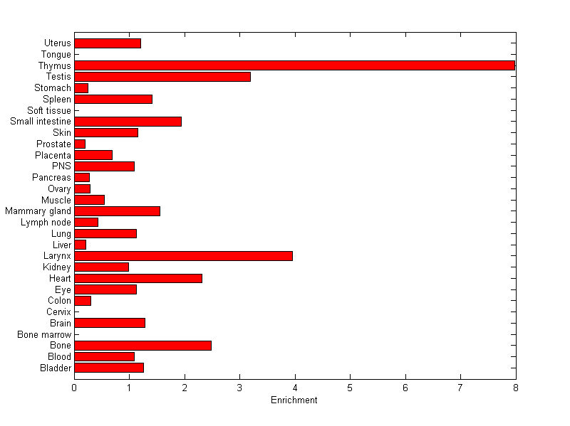 The expression level is normalized with tissue-library size. Each value for a gene in a tissue is a ratio of observed ESTs to the expected one in this tissue. The expected number of ESTs is the product of total ESTs of the gene and the fraction of total ESTs in the tissue among all ESTs in 30 tissues.