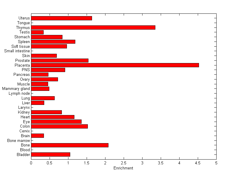 The expression level is normalized with tissue-library size. Each value for a gene in a tissue is a ratio of observed ESTs to the expected one in this tissue. The expected number of ESTs is the product of total ESTs of the gene and the fraction of total ESTs in the tissue among all ESTs in 30 tissues.