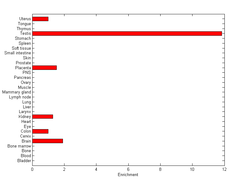 The expression level is normalized with tissue-library size. Each value for a gene in a tissue is a ratio of observed ESTs to the expected one in this tissue. The expected number of ESTs is the product of total ESTs of the gene and the fraction of total ESTs in the tissue among all ESTs in 30 tissues.