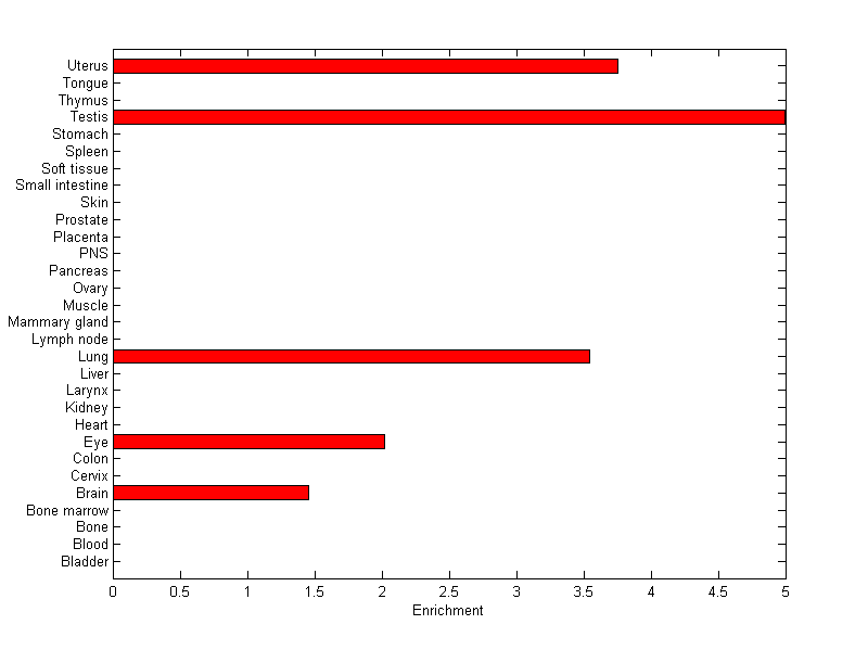 The expression level is normalized with tissue-library size. Each value for a gene in a tissue is a ratio of observed ESTs to the expected one in this tissue. The expected number of ESTs is the product of total ESTs of the gene and the fraction of total ESTs in the tissue among all ESTs in 30 tissues.
