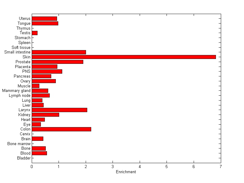 The expression level is normalized with tissue-library size. Each value for a gene in a tissue is a ratio of observed ESTs to the expected one in this tissue. The expected number of ESTs is the product of total ESTs of the gene and the fraction of total ESTs in the tissue among all ESTs in 30 tissues.