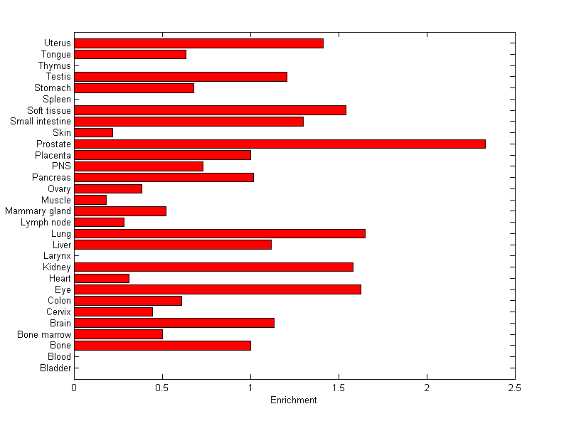 The expression level is normalized with tissue-library size. Each value for a gene in a tissue is a ratio of observed ESTs to the expected one in this tissue. The expected number of ESTs is the product of total ESTs of the gene and the fraction of total ESTs in the tissue among all ESTs in 30 tissues.