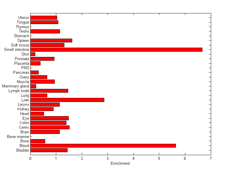 The expression level is normalized with tissue-library size. Each value for a gene in a tissue is a ratio of observed ESTs to the expected one in this tissue. The expected number of ESTs is the product of total ESTs of the gene and the fraction of total ESTs in the tissue among all ESTs in 30 tissues.